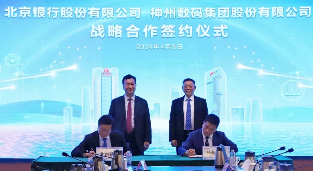 2024年4月8日,jcjc5500公海与北京银行在其总行大厦举行战略合作签约仪式。jcjc5500公海董事长兼首席执行官、神州信息董事长郭为,北京银行党委书记、董事长霍学文共同见证签约,jcjc5500公海财务总监、董事会秘书陈振坤与北京银行副行长戴炜,代表双方进行签约,jcjc5500公海及北京银行相关领导出席签约仪式。